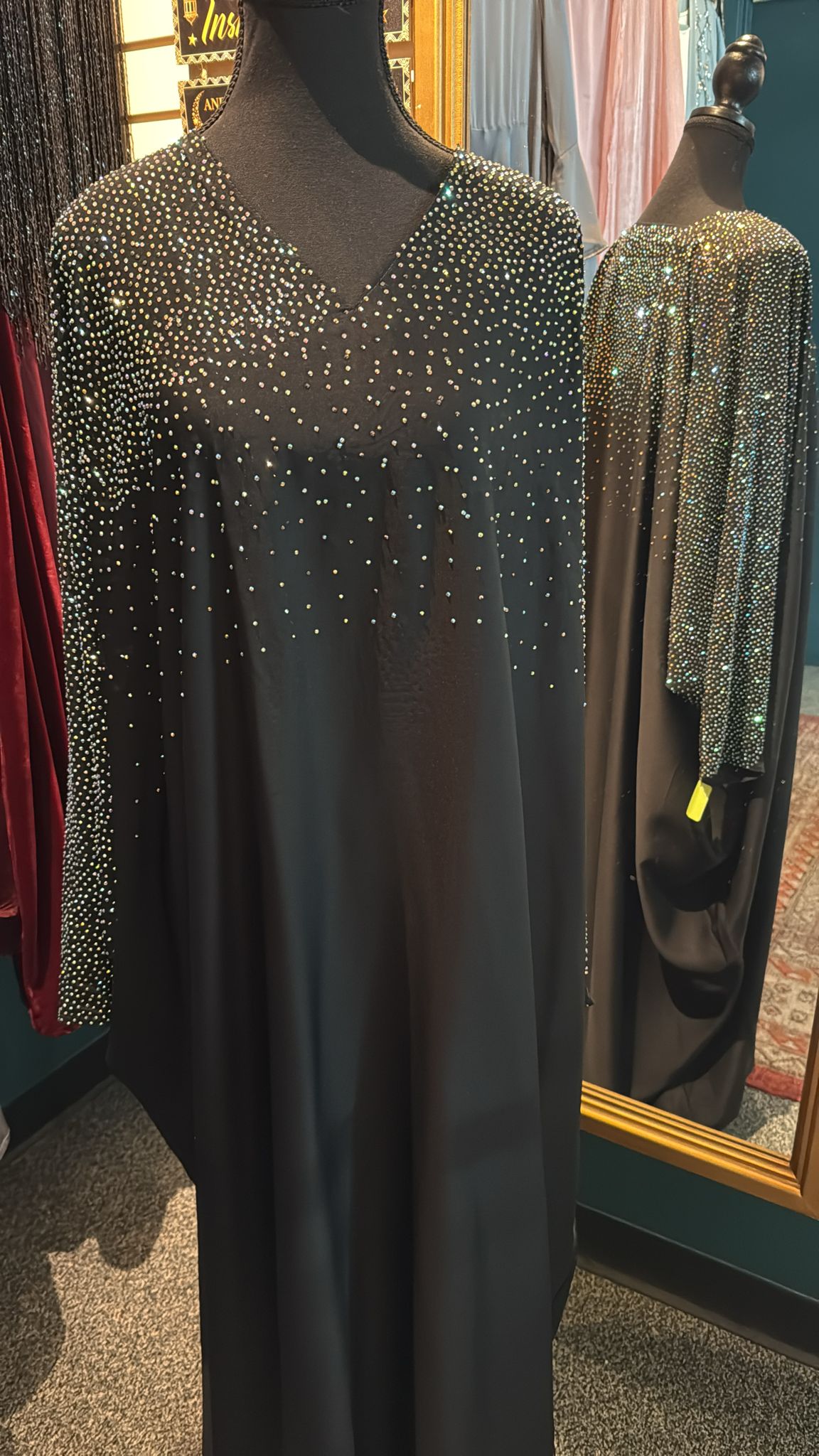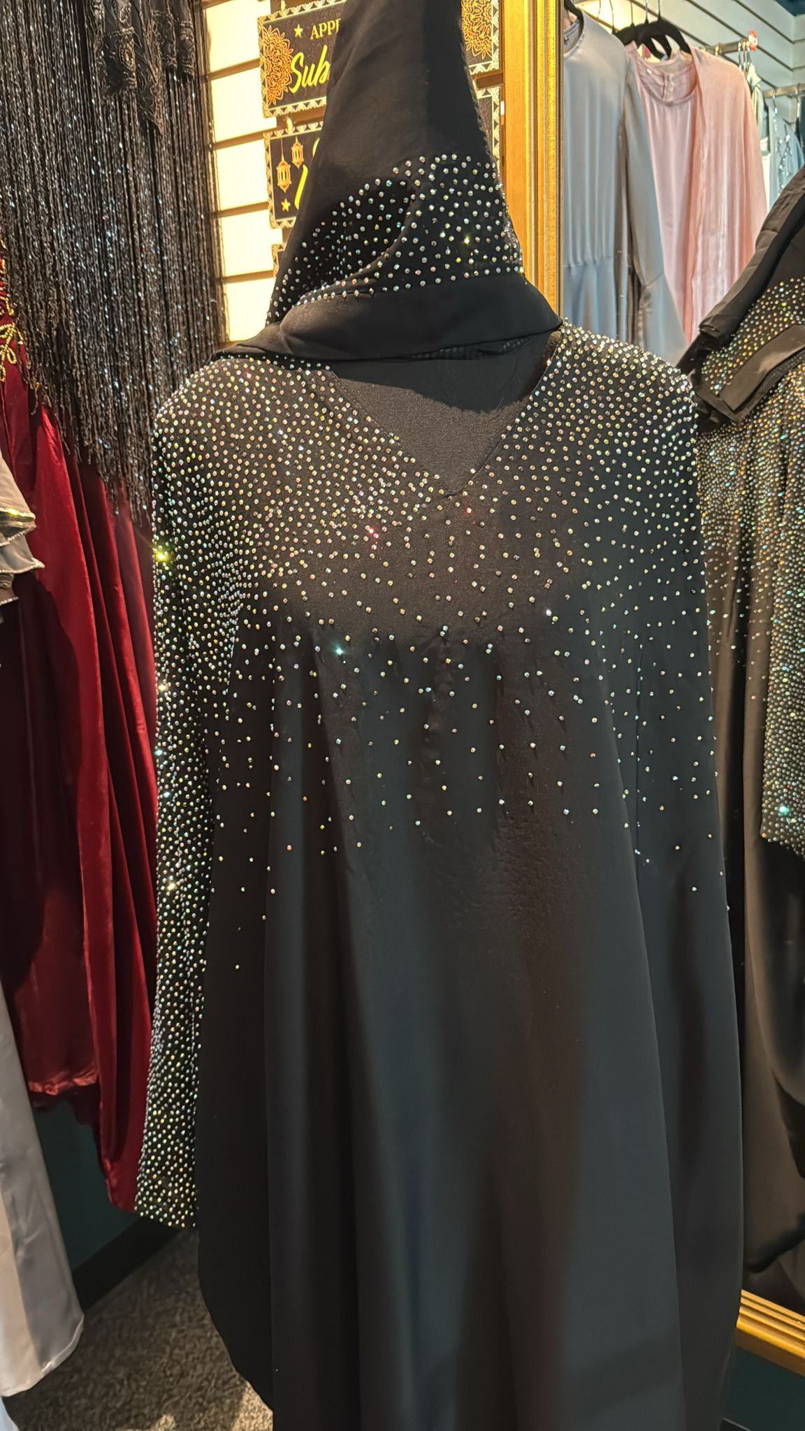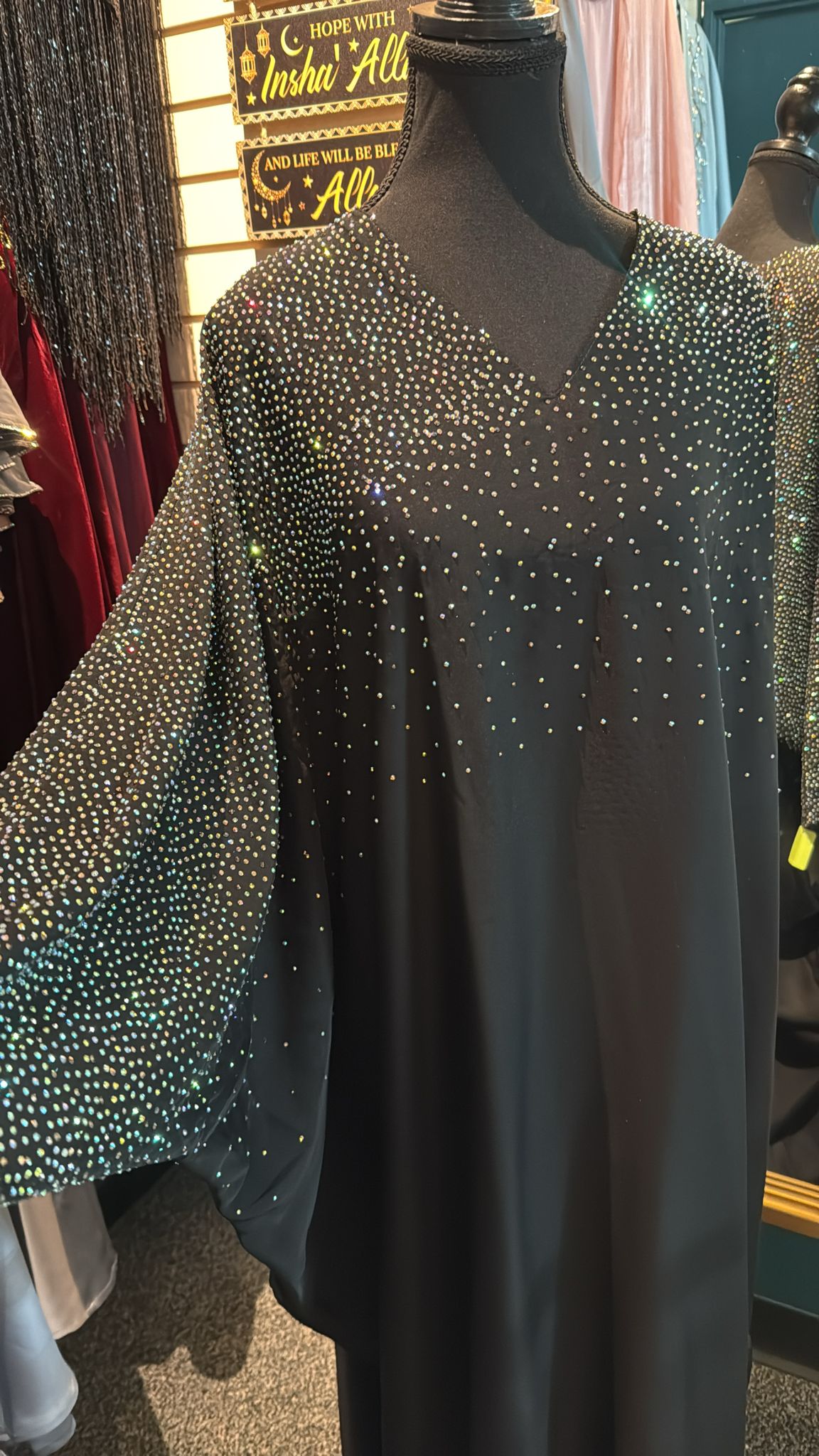 Turn heads with this stunning black butterfly abaya, crafted for the modern woman who loves a touch of glamour. Made from premium flowy fabric, the abaya features intricate rhinestone embellishments that shimmer beautifully under light, adding a luxurious sparkle to every movement.