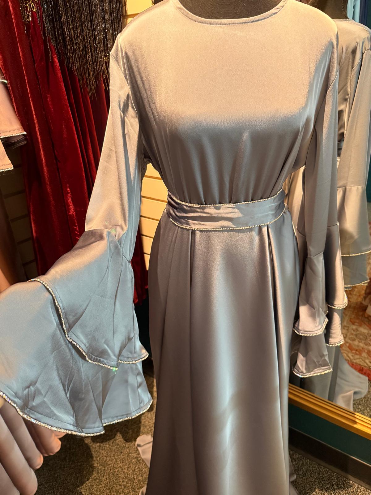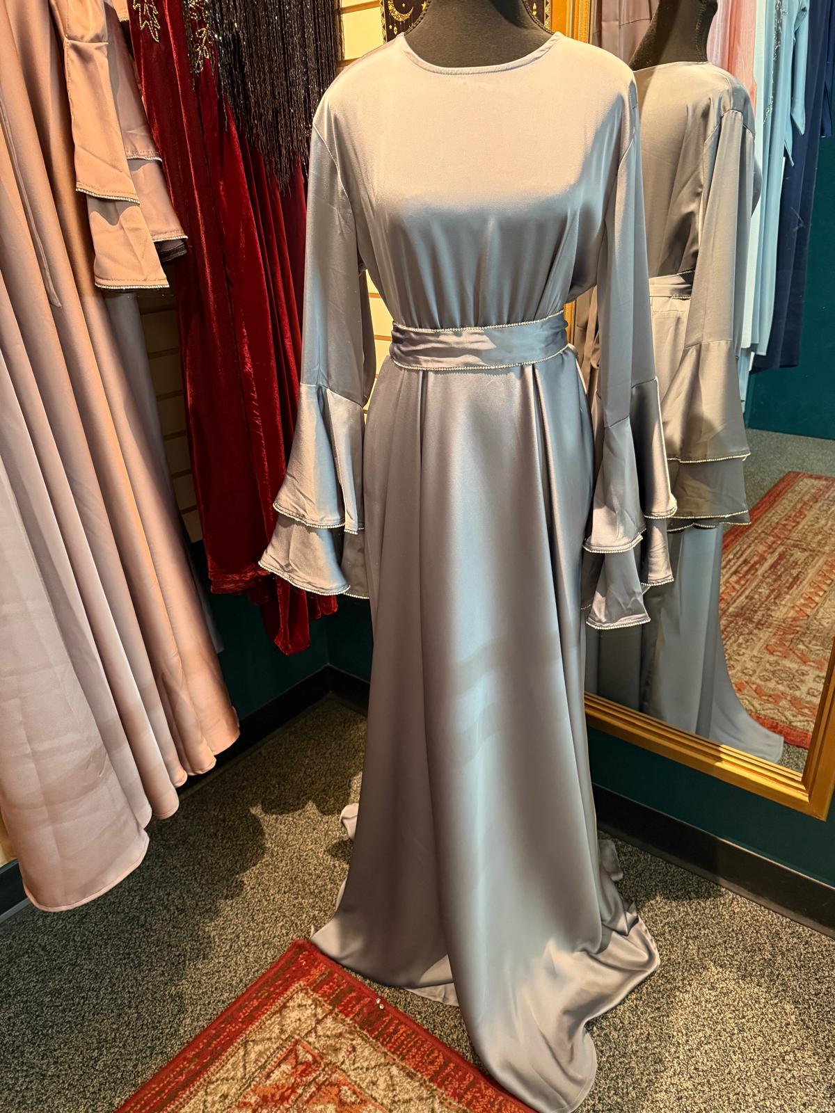 The dress features long sleeves, a high neckline, and a floor-length silhouette—beautifully tailored to create a flattering yet modest look. Subtle embellishments like delicate sequins, metallic threading, or lace overlays add just the right amount of sparkle, making it perfect for weddings, formal events, or special celebrations.