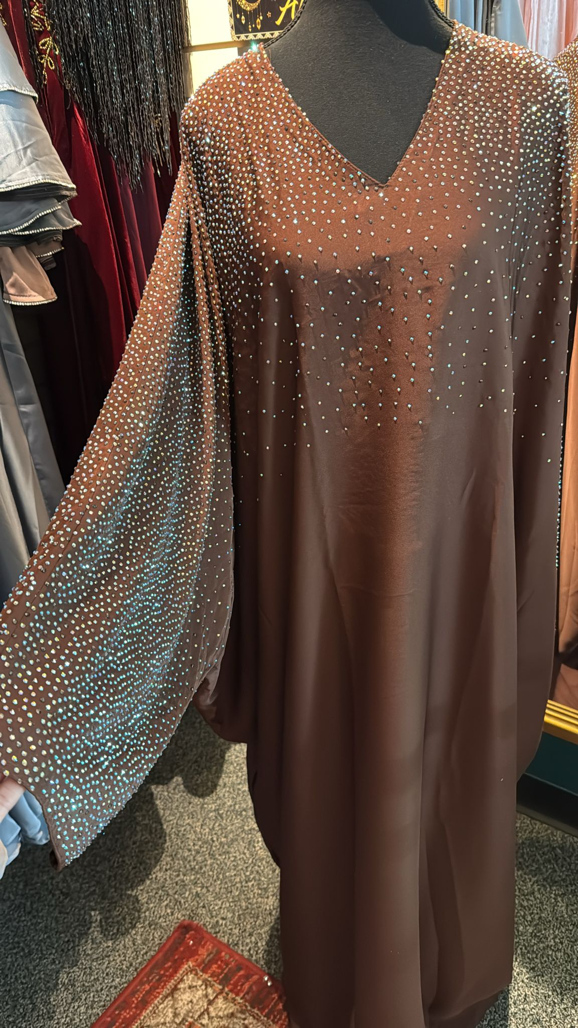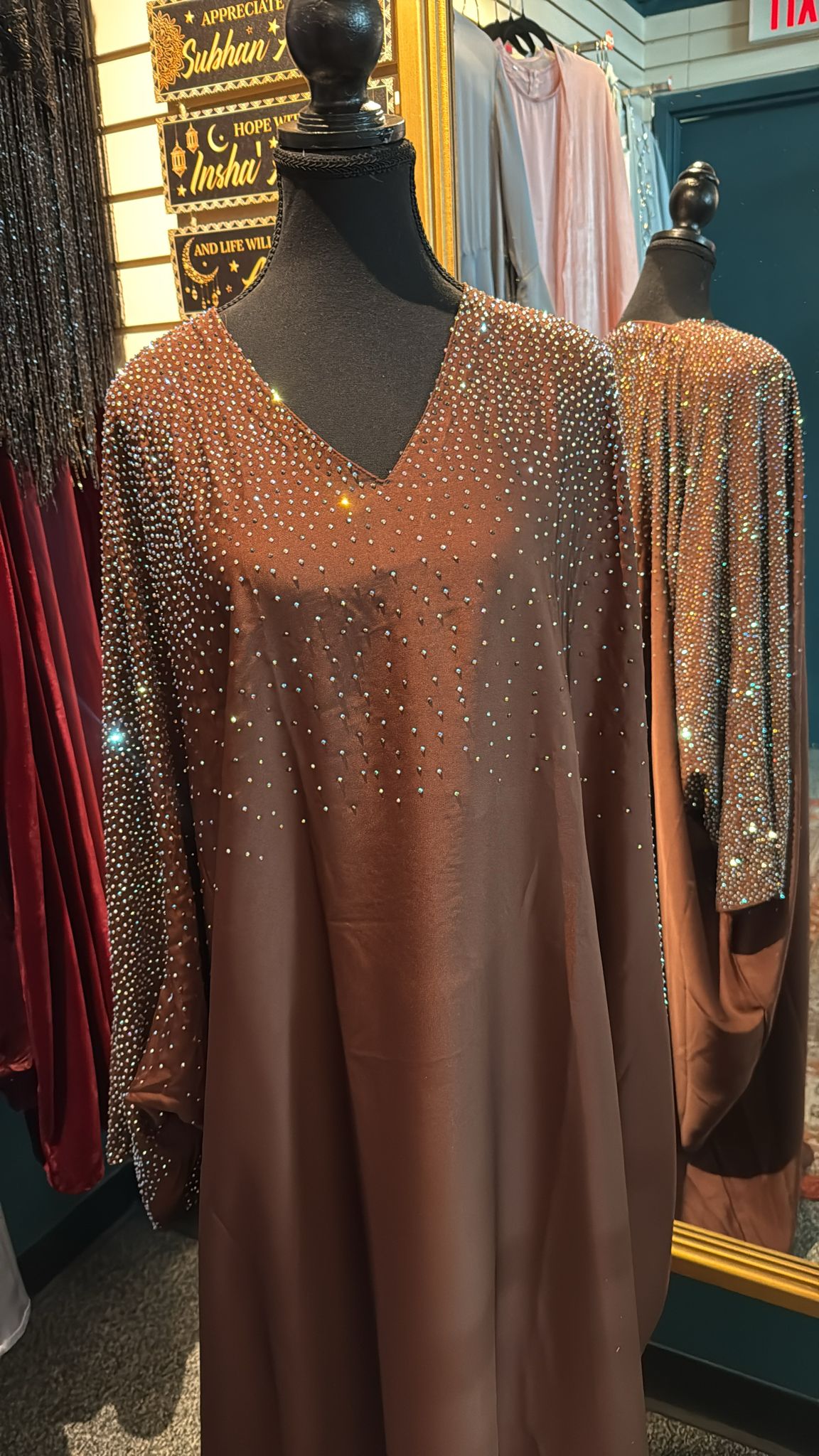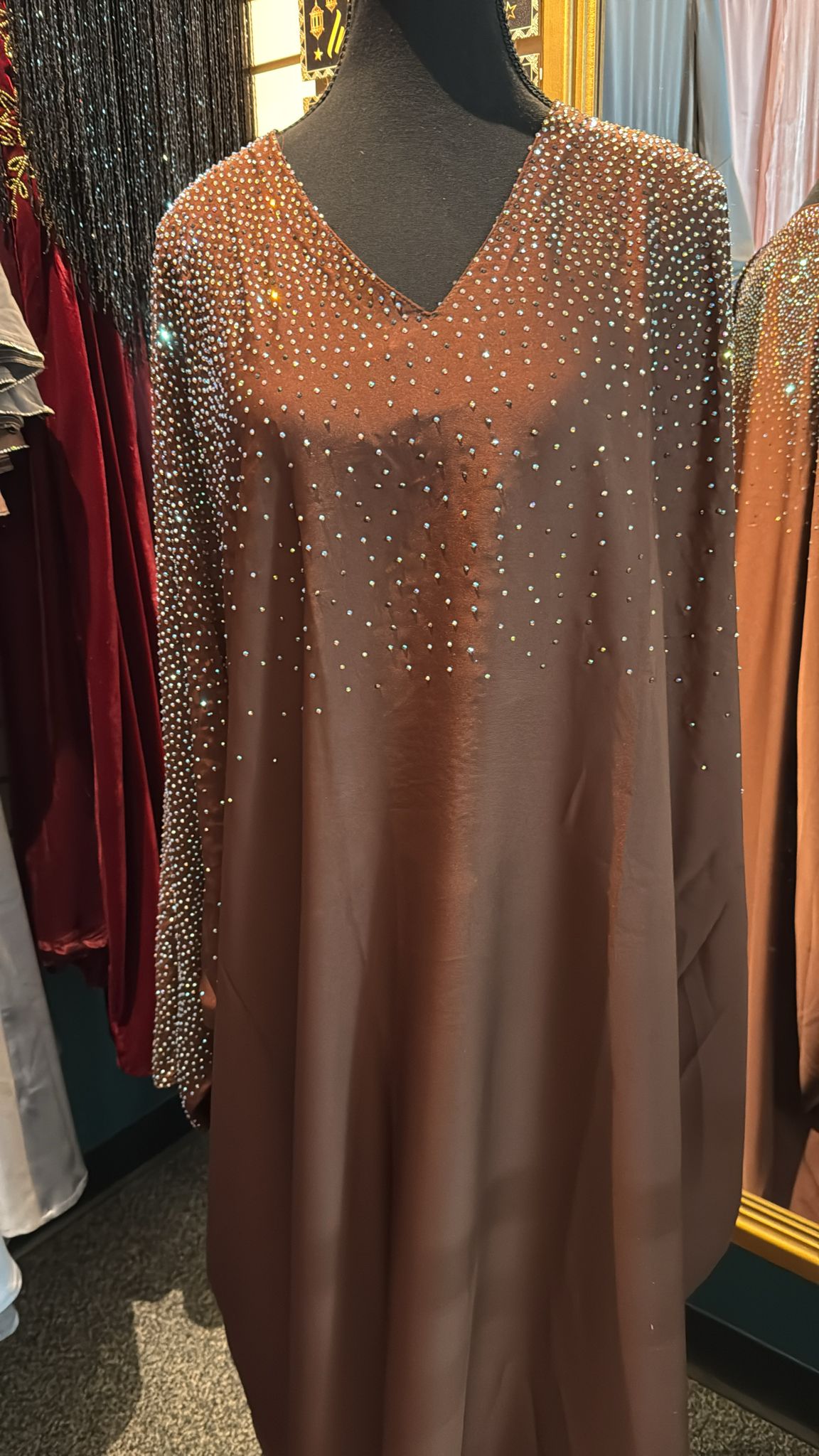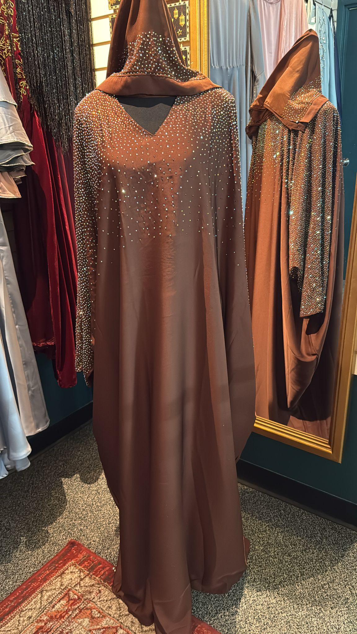 Turn heads with this stunning brown blingy abaya, crafted for the modern woman who loves a touch of glamour. Made from premium flowy fabric, the abaya features intricate rhinestone embellishments that shimmer beautifully under light, adding a luxurious sparkle to every movement.