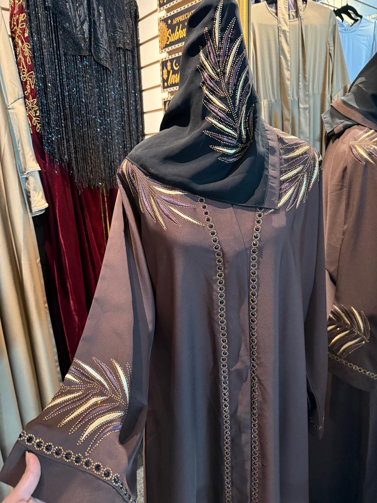 Radiating warmth and sophistication, this brown abaya is a stunning blend of traditional craftsmanship and modern elegance. Crafted from premium-quality fabric, it features intricate thread embroidery beautifully complemented by delicate stone embellishments, adding a subtle sparkle and artistic charm to the overall design.